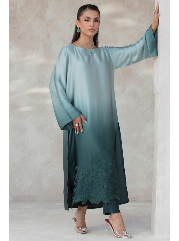 Transitioning from an ethereal hue to a deep, emerald green, this chic ensemble showcases a seamless gradient. Crafted from premium shamose silk with a flaired sleeve design, An impeccable drape and a touch of refined elegance. This ensemble comes with straight ombre silk trousers.